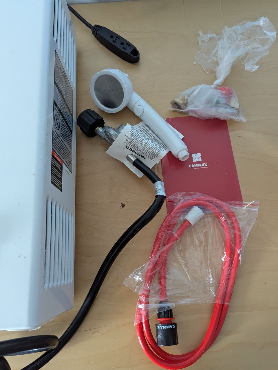 • Included Components: 1x Tankless Water Heater, 1x Gas Regulator (CSA Certified), 1x On/Off Switch Shower Head, 1x Garden Hose, 1x Adapter