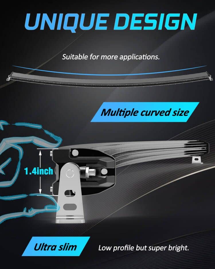 ✅ Curved Single Row Design: A rare 20-inch curved single row light bar with a slim profile of just 1.43 inches, ideal for tight mounting spaces like bumpers, behind grilles, or UTV roofs