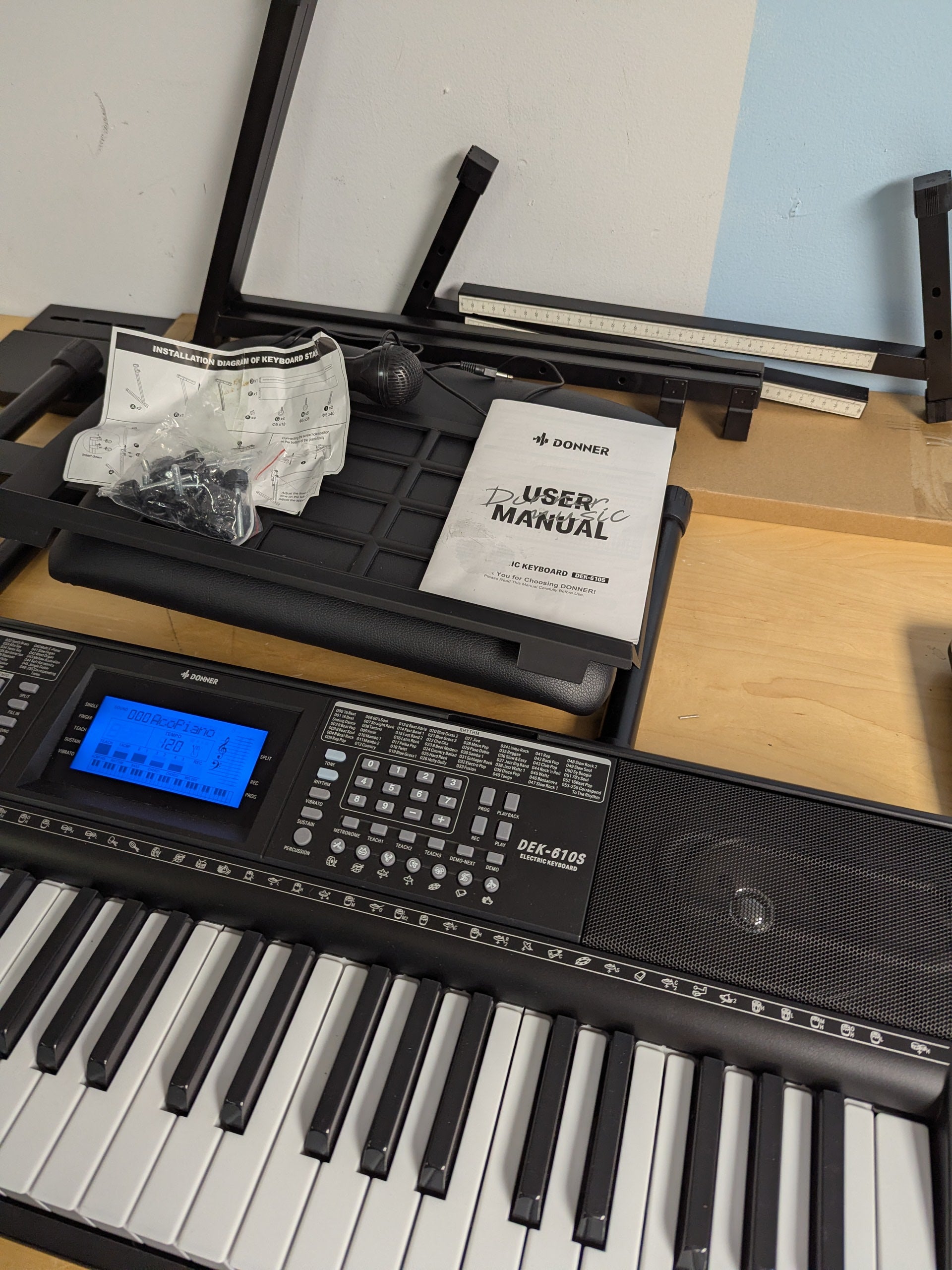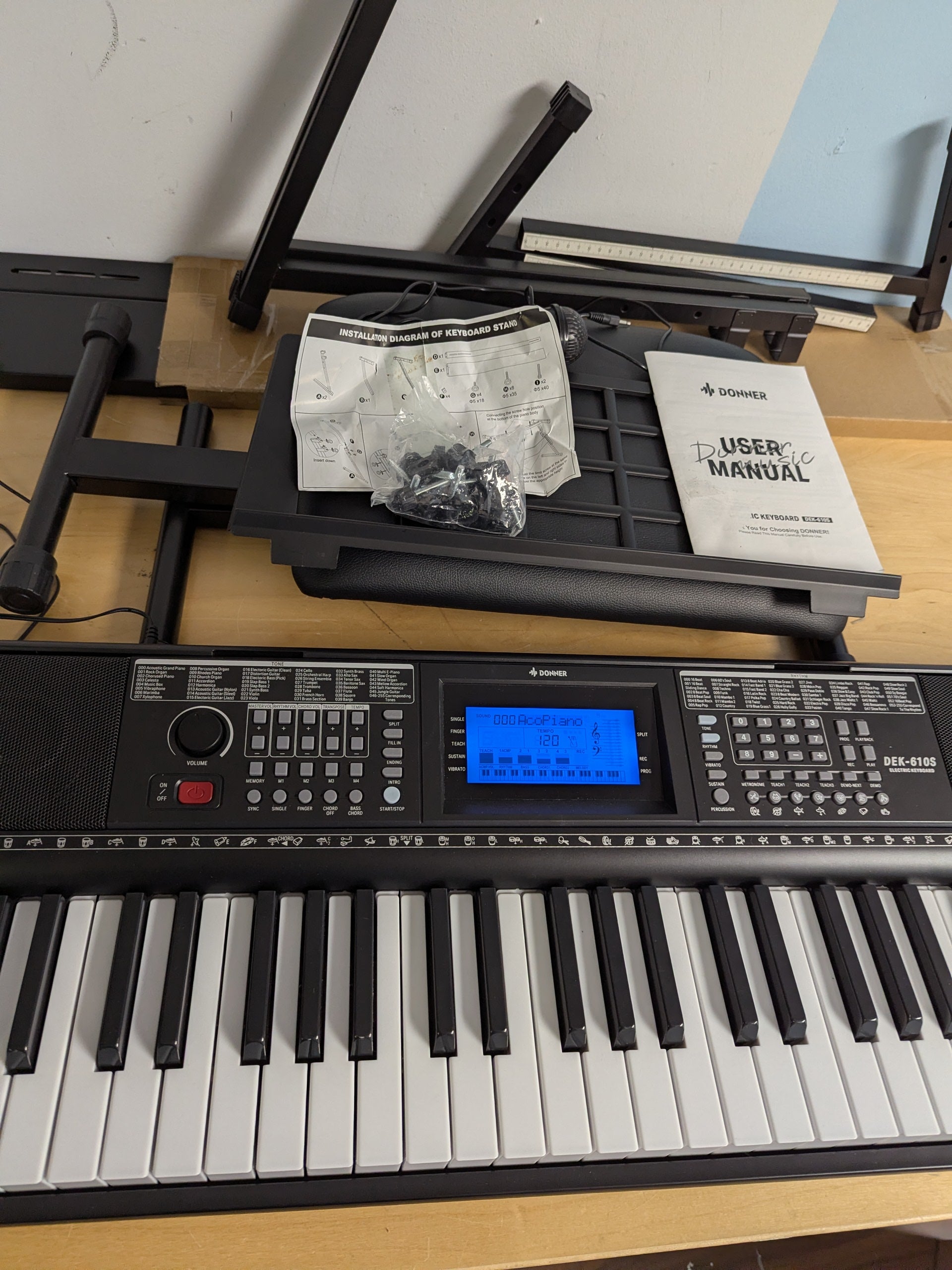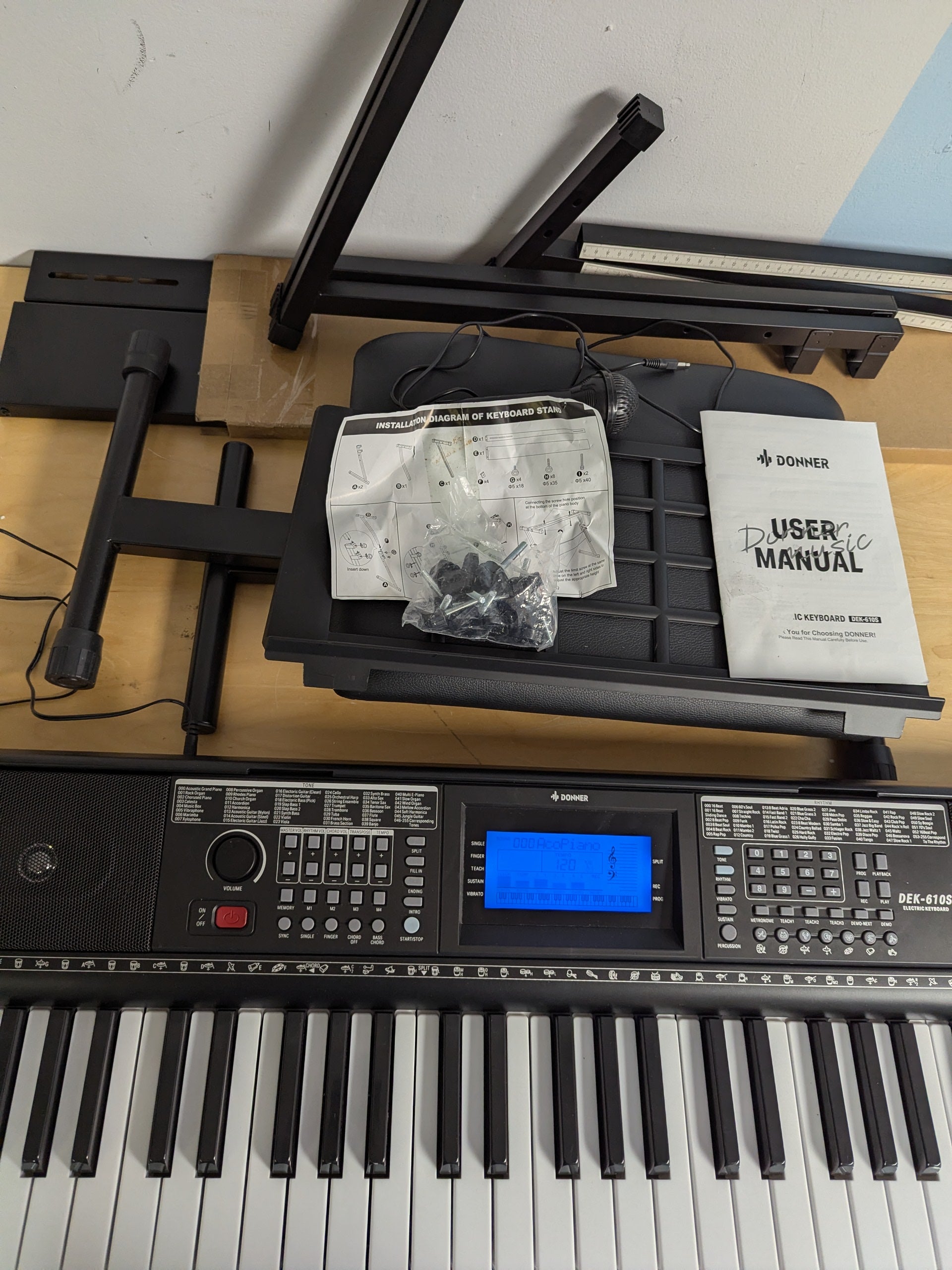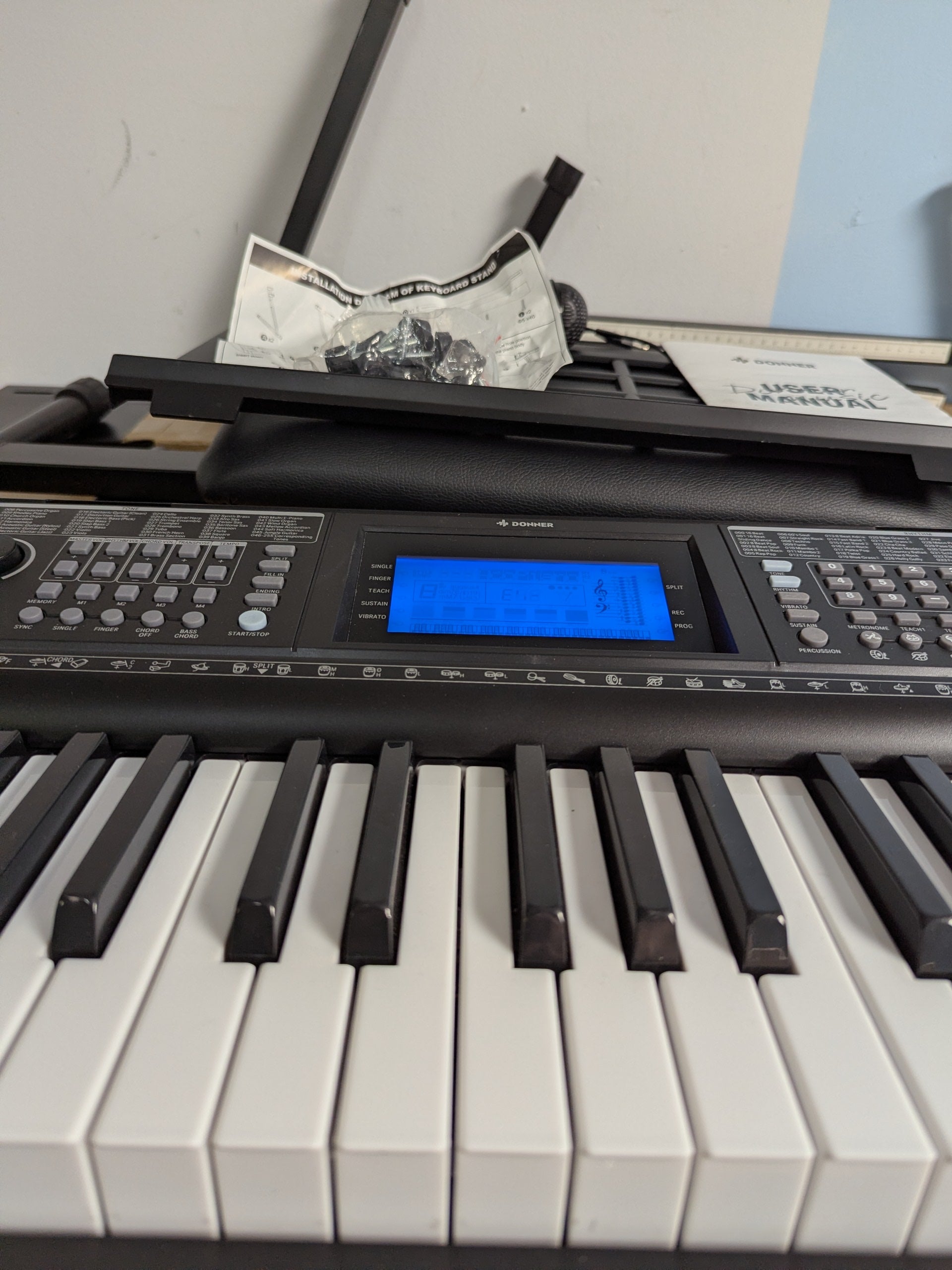 Unleash your musical potential with the Donner DEK-610S 61-Key Electric Keyboard Piano Kit. Designed for beginners, this all-inclusive package features a full-sized keyboard with 249 voices and 249 rhythms, offering endless creative possibilities. The included piano stand, adjustable-height bench, sheet music stand, microphone, and power adapter provide everything you need to start playing right out of the box.