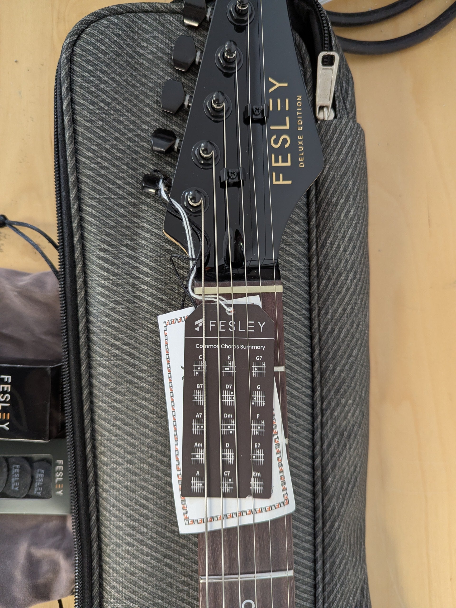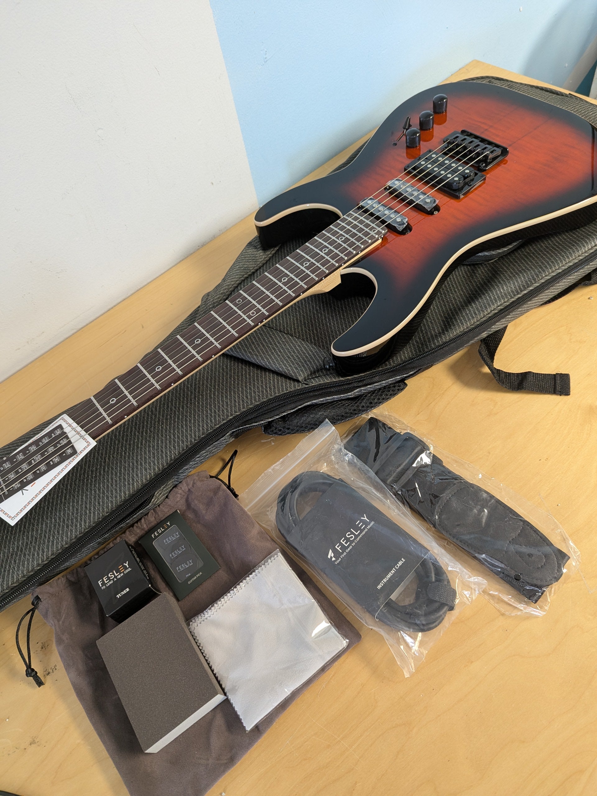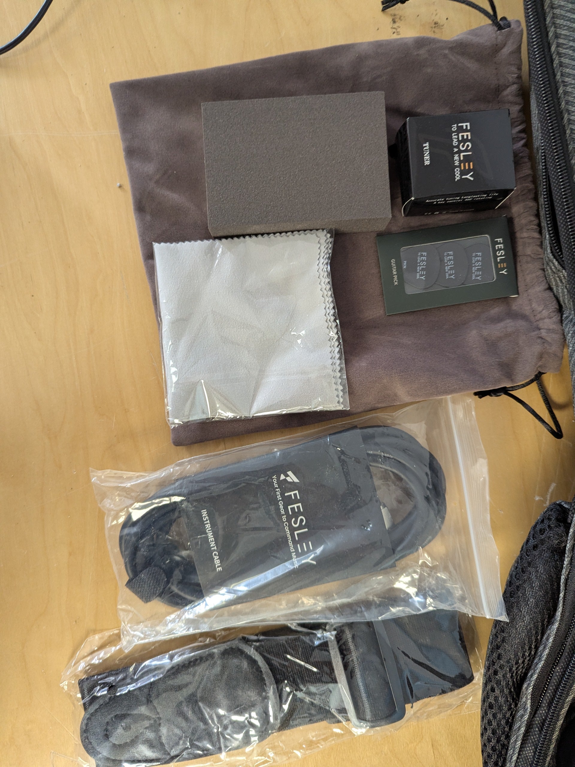• Includes: Digital tuner, guitar picks, adjustment wrenches, tremolo bar, gig bag, strap, cables, cleaning cloth, storage bag, sanding block, instructions