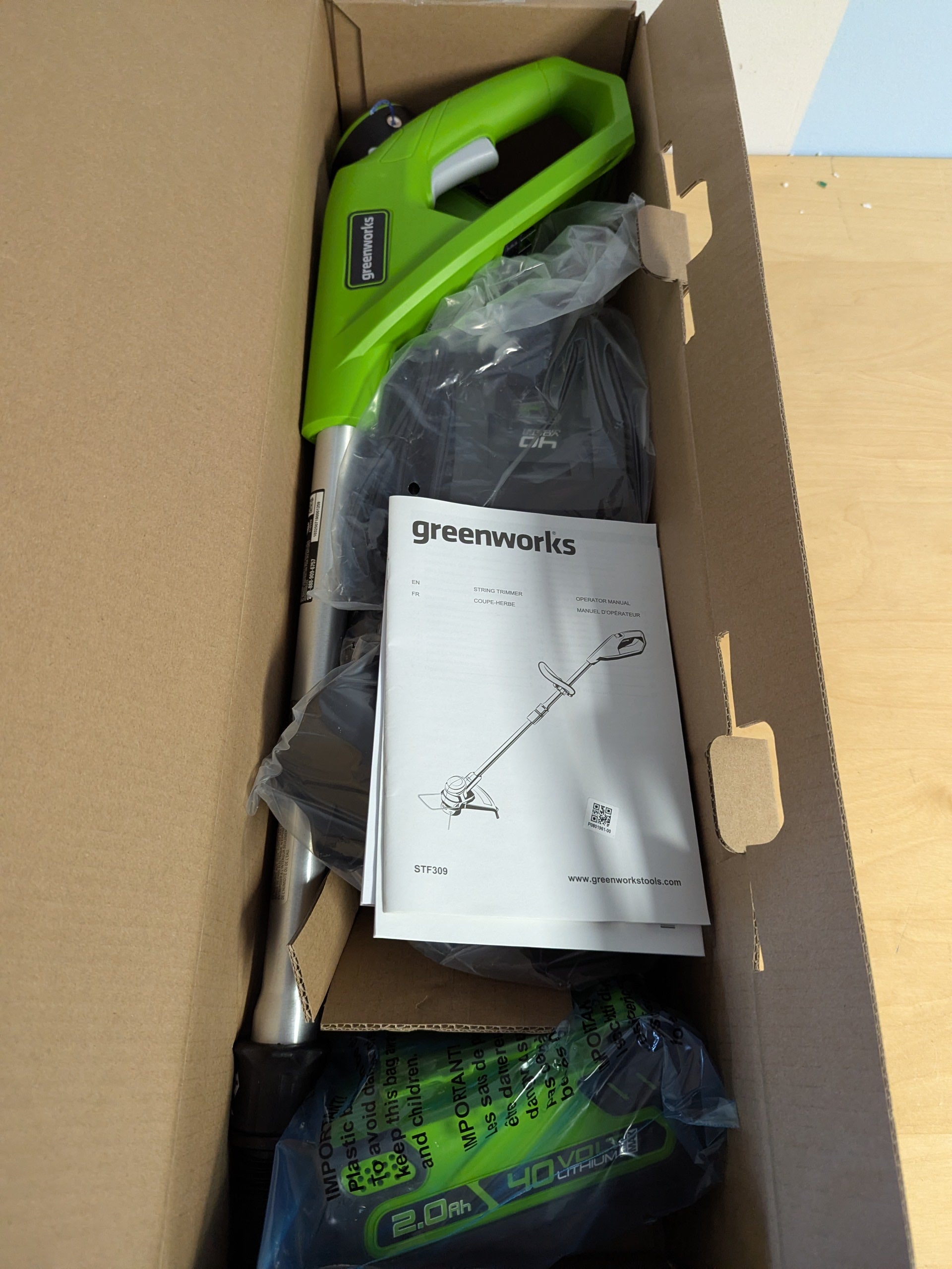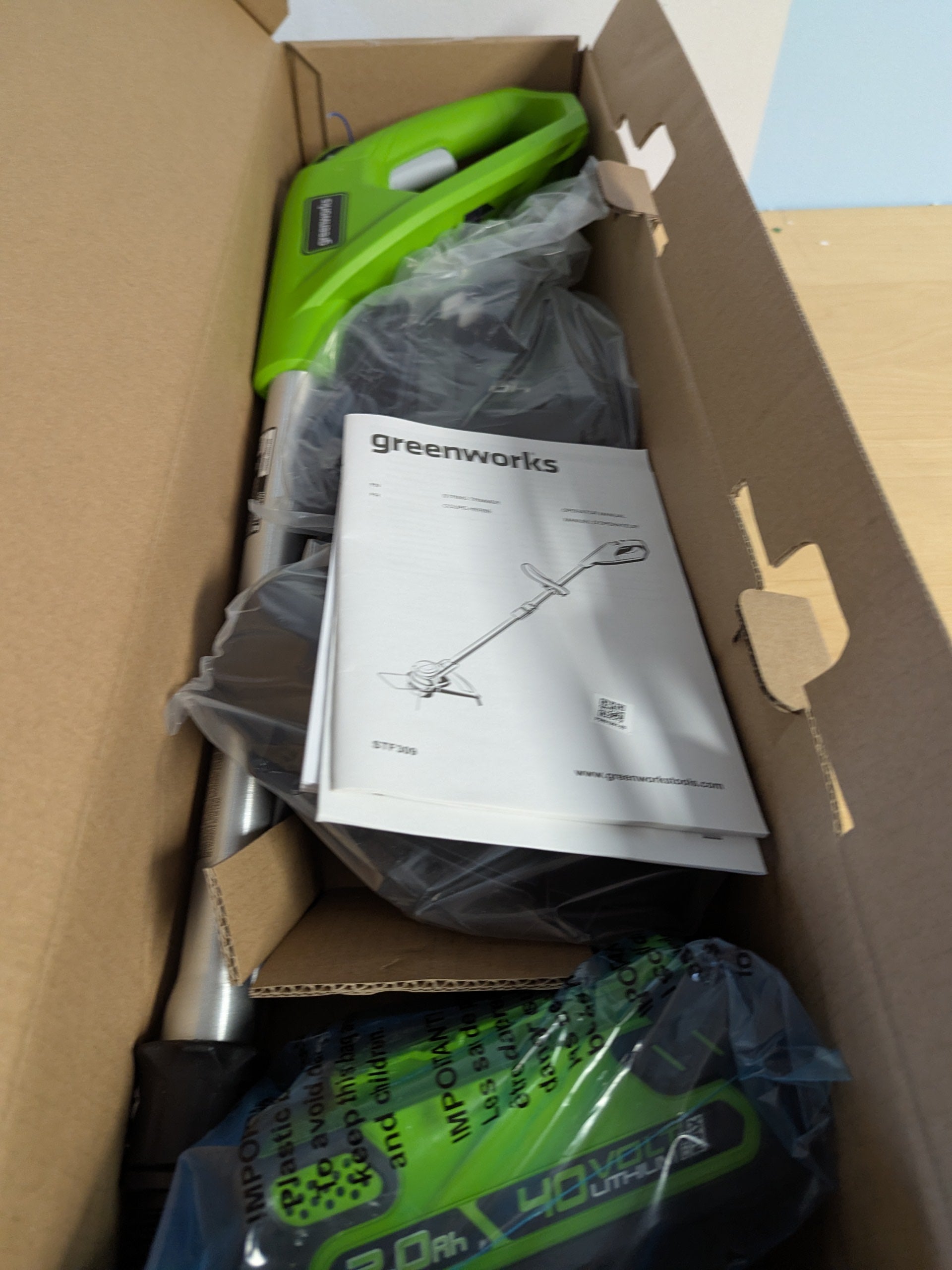 Condition - Like new Efficient yard work starts with the Greenworks 40V 12" String Trimmer, 2 Ah battery and charger... Read more