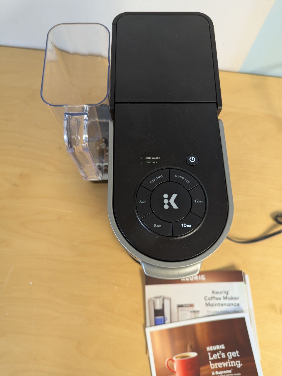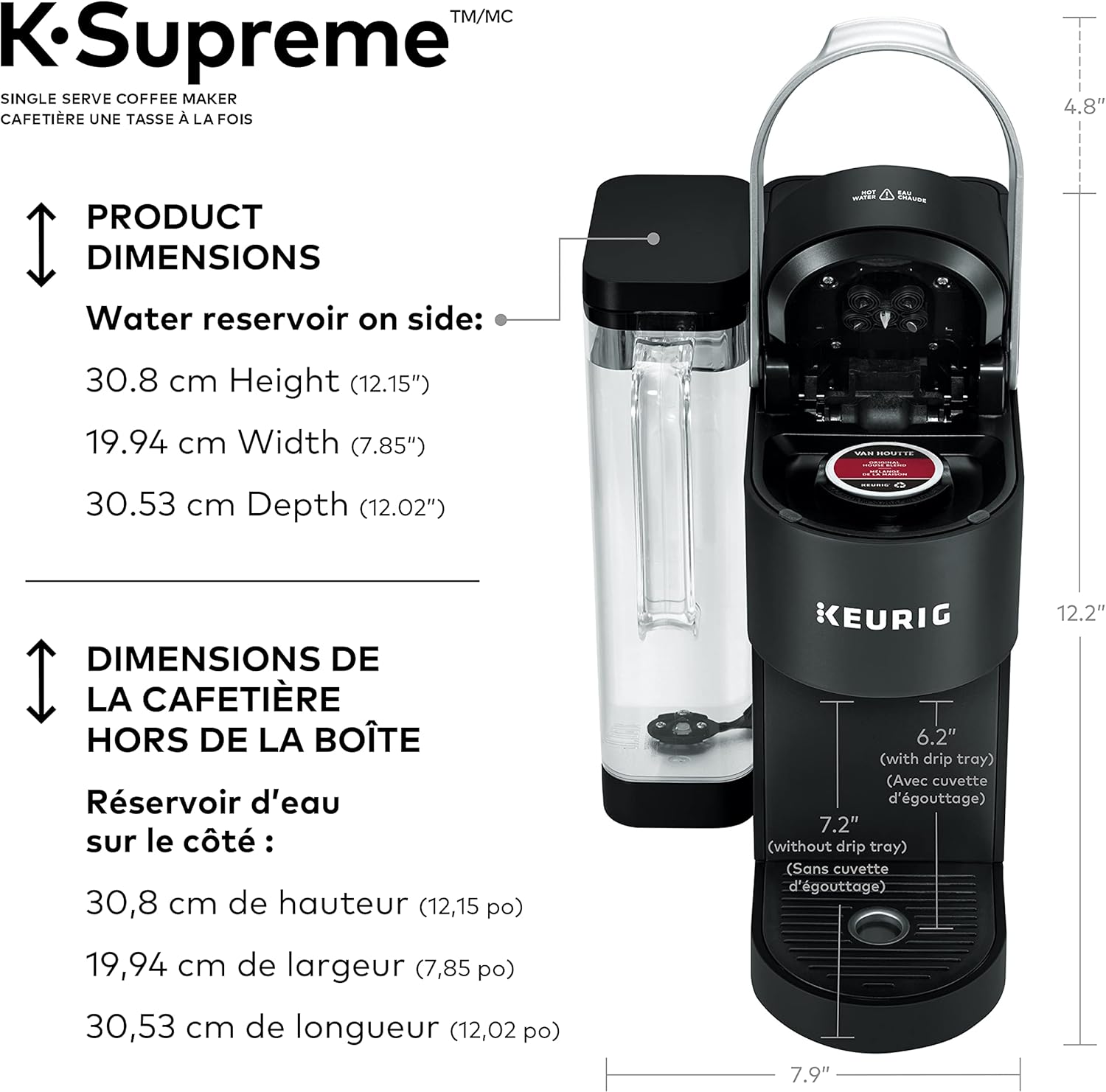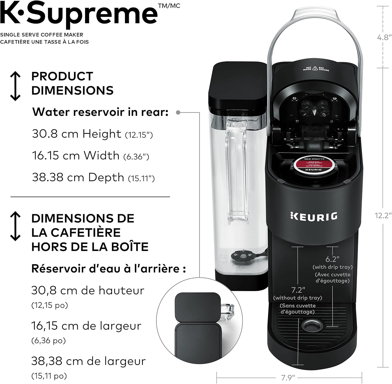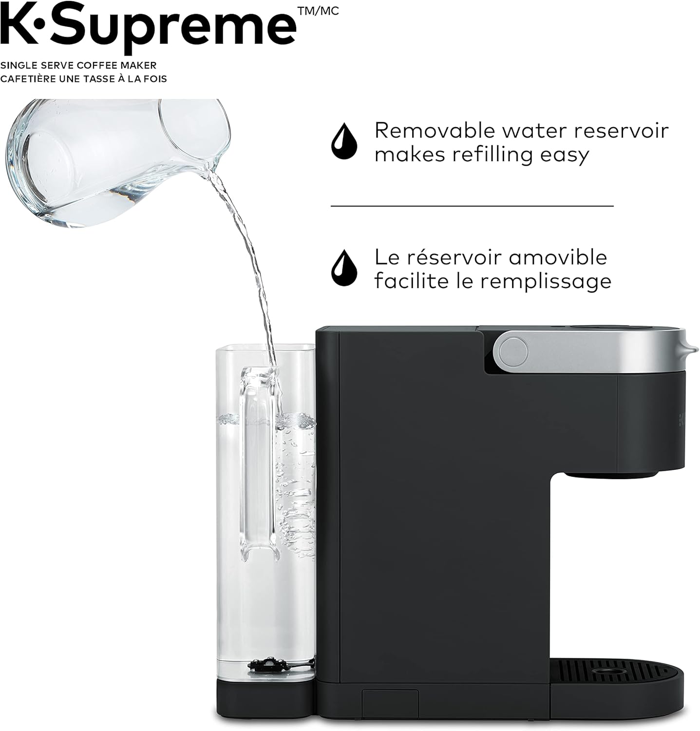 With its 1.95 L (66 oz) dual-position reservoir, the K-Supreme offers flexible placement and easy refilling, while its travel mug-friendly design accommodates mugs up to 17.8 cm (7”) tall. The lightweight, plastic construction makes it ideal for home, office, or RV use, and its manual operation ensures simplicity without compromising quality.