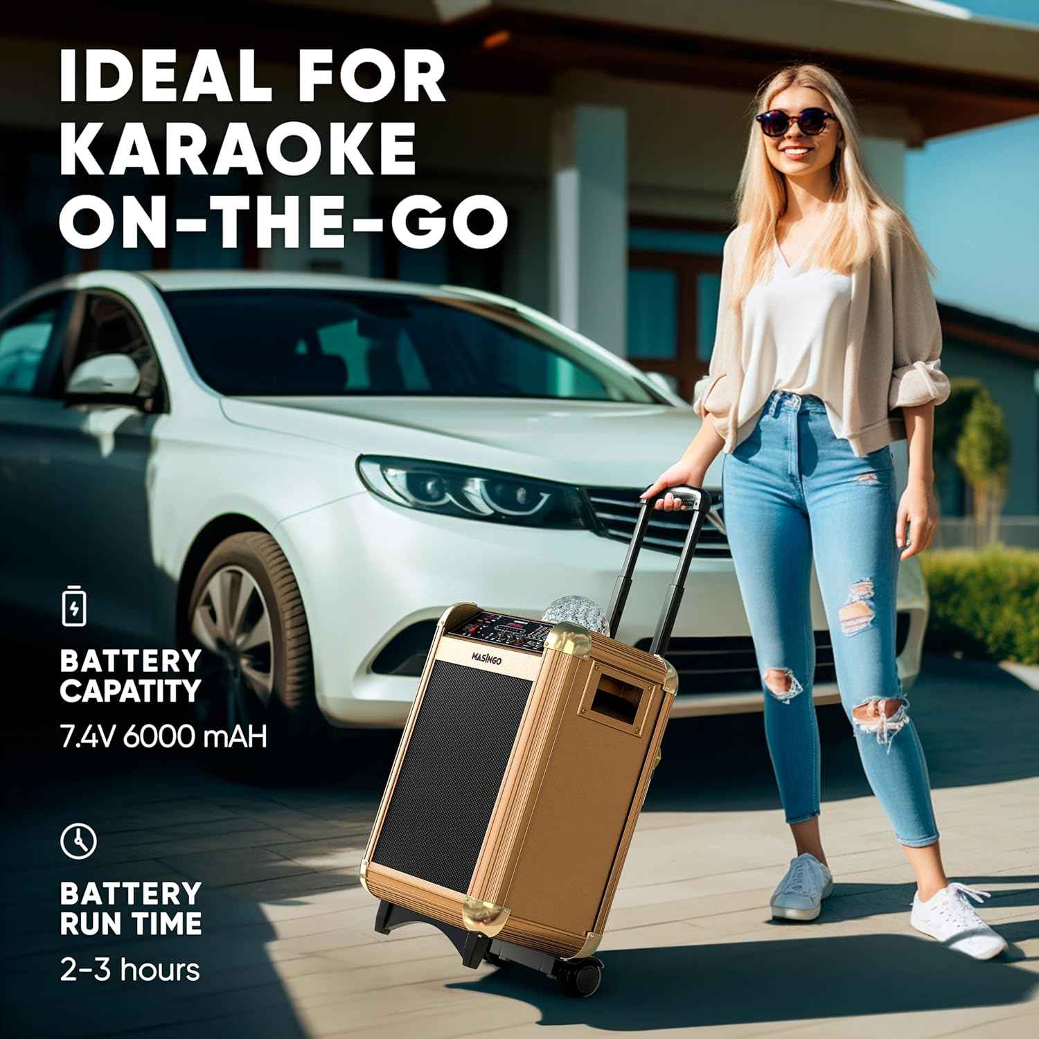 âś… Portable & Rechargeable Design: Equipped with wheels, telescoping handle, and 8-hour battery life for on-the-go performances
