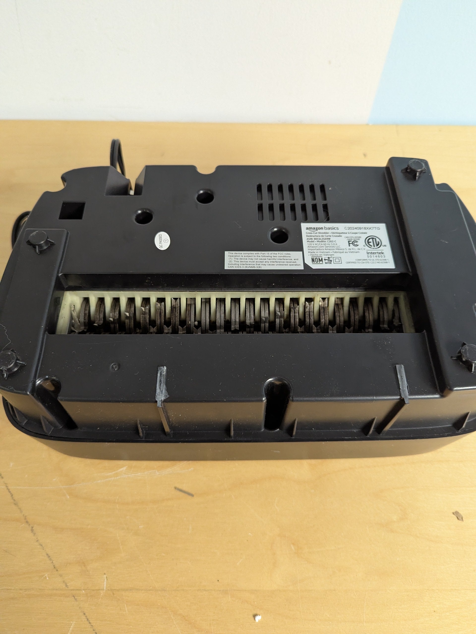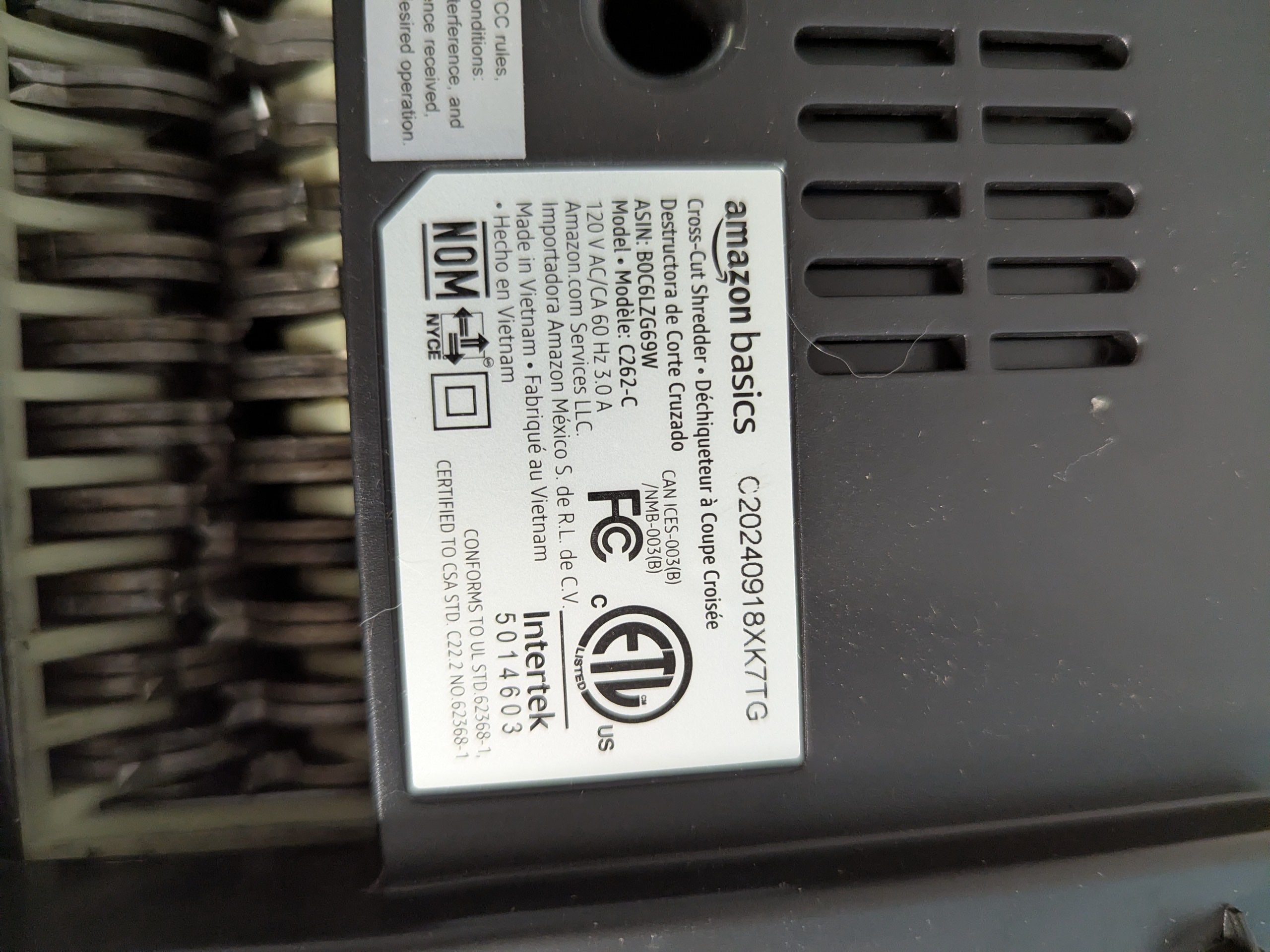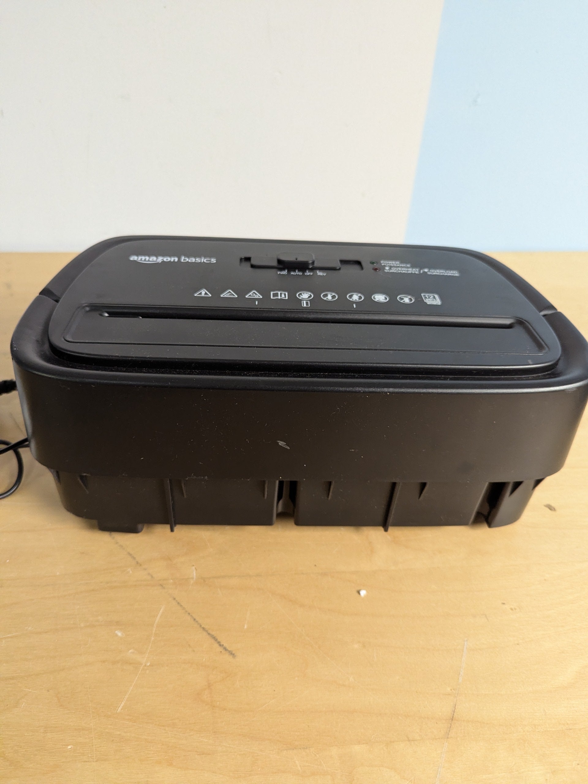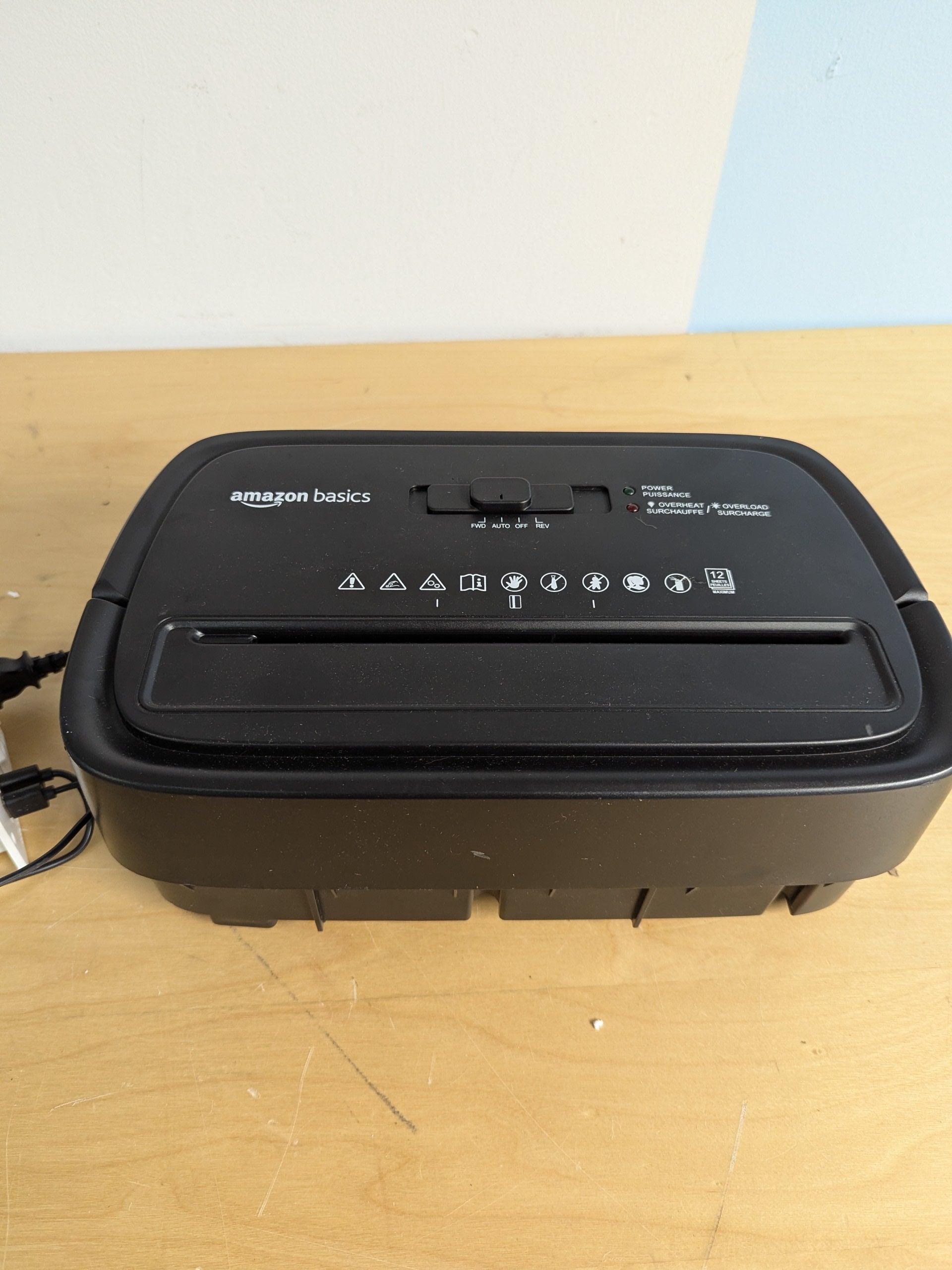 Secure your sensitive information with the NO BIN Amazon Basics 12-Sheet Cross-Cut Paper Shredder and Credit Card Shredder. This used item is in good condition, with no bin or box included.