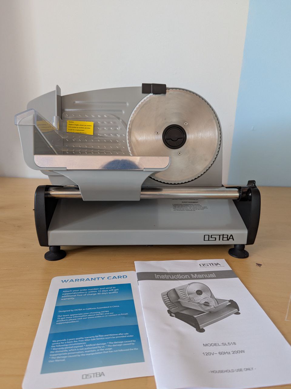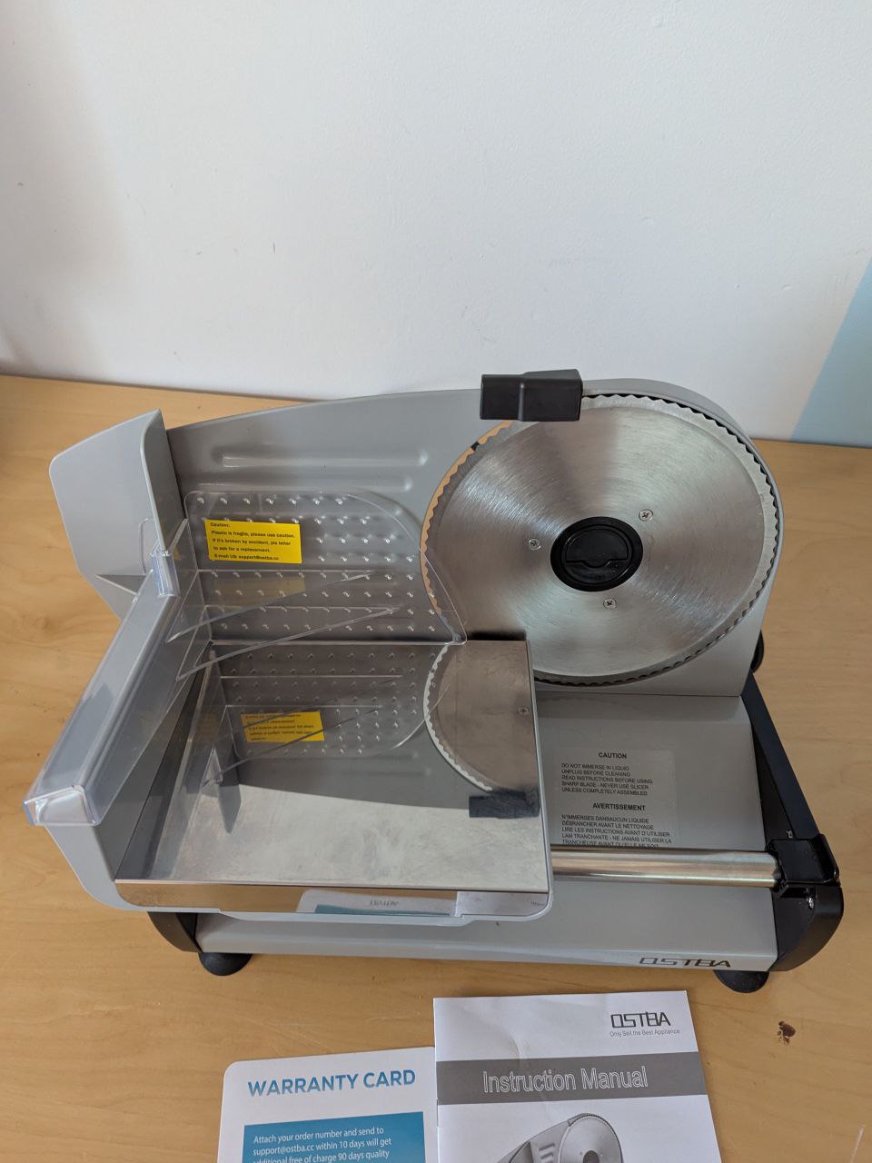 Efficiently slice with the OSTBA Electric Meat Slicer in Silver. Designed for precision and ease of use, this compact deli slicer delivers consistent cuts for a variety of foods while maintaining kitchen calm with its low-noise operation.