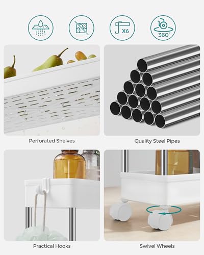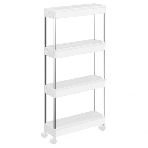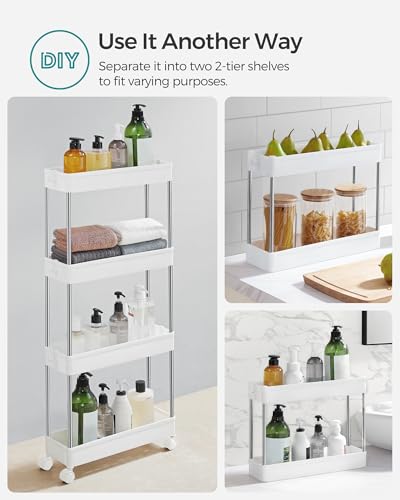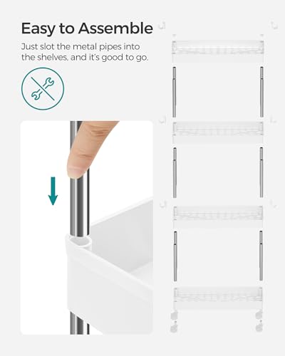 Maximize space with the SONGMICS Slim Storage Cart, a 4-tier rolling cart designed to fit in narrow spaces like kitchens, bathrooms, and offices. Its compact dimensions of 14.4 x 42 x 86 cm make it ideal for small areas without compromising on storage capacity.