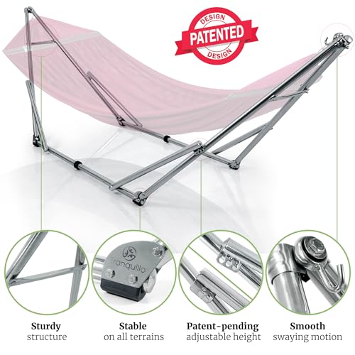 Enhance your relaxation with the Tranquillo Double Hammock with Stand. Designed for both indoor and outdoor use, this durable 650lb capacity hammock features a solid Grade 201 stainless steel stand with rubber feet to prevent scratches and ensure stability. The innovative 30s set up design allows for quick and easy adjustments, while the revolutionary notch system ensures compatibility with various heights and preferences.